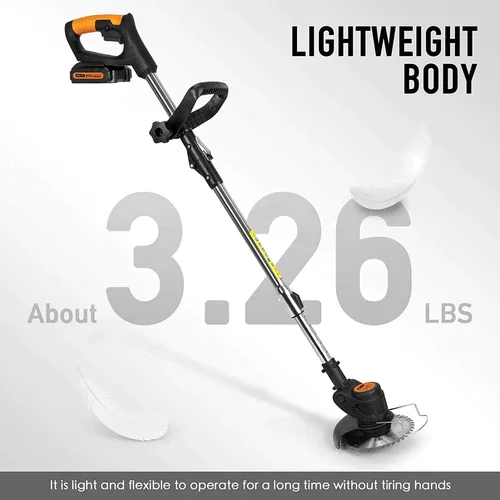 The battery-powered lawn mower weighs only 4.6lbs (2.1kg). It's quieter/safer than gas and lighter than wire. so you can trim in tight, awkward spaces or so you can traverse uneven terrain. This lawn mower is the perfect choice for lawn arthritis patients.