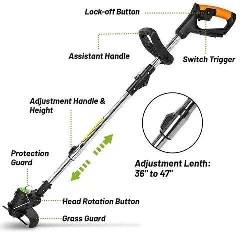 The angle of the machine head can be adjusted within 90°, convenient for trimming corners and dead corners such as wall corners, flower bed edges, etc.