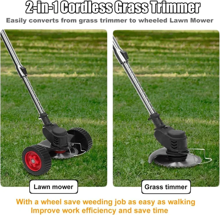 Cordless lawn mower, trimmer and push mower all in one. Easily converts from weed eater to wheeled lawn mower. Make your weed eater the envy of the neighborhood.